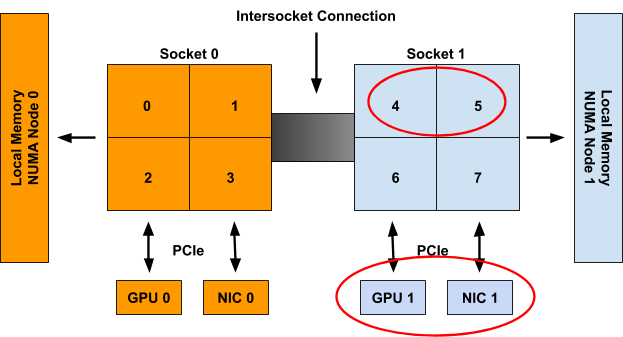 For example, in Figure 1, CPUs 0-3 are said to be part of NUMA node 0, whereas CPUs 4-7 are part of NUMA node 1. Likewise GPU 0 and NIC 0 are said to be part of NUMA node 0 because they are attached to Socket 0, whose CPUs are all part of NUMA node 0. The same is true for GPU 1 and NIC 1 on NUMA node 1.