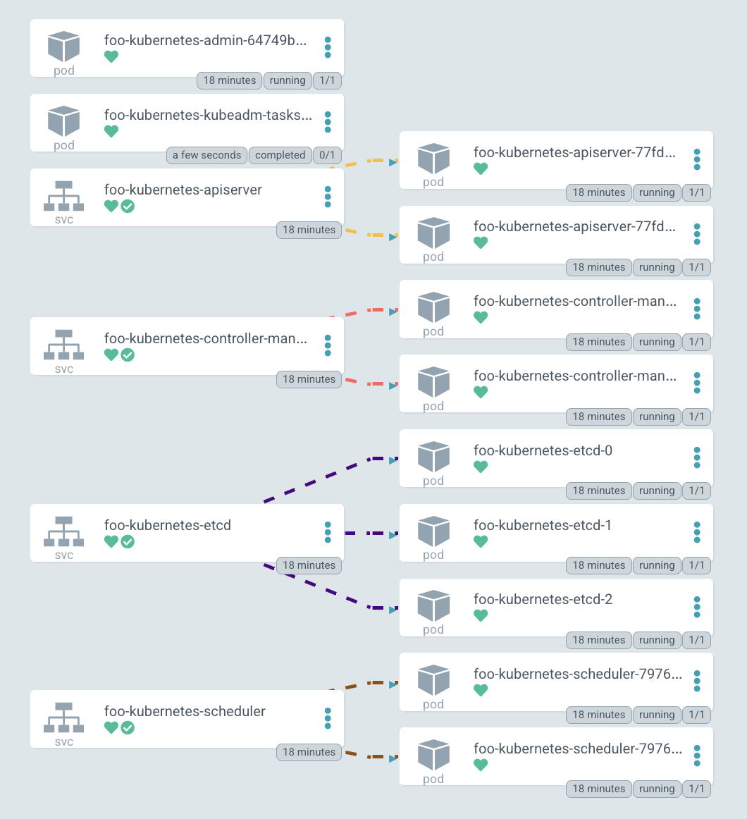 Here is the diagram of the deployed cluster. You can see services for all Kubernetes components: apiserver, controller-manager, etcd-cluster and scheduler. And the pods on right side to which they forward traffic.